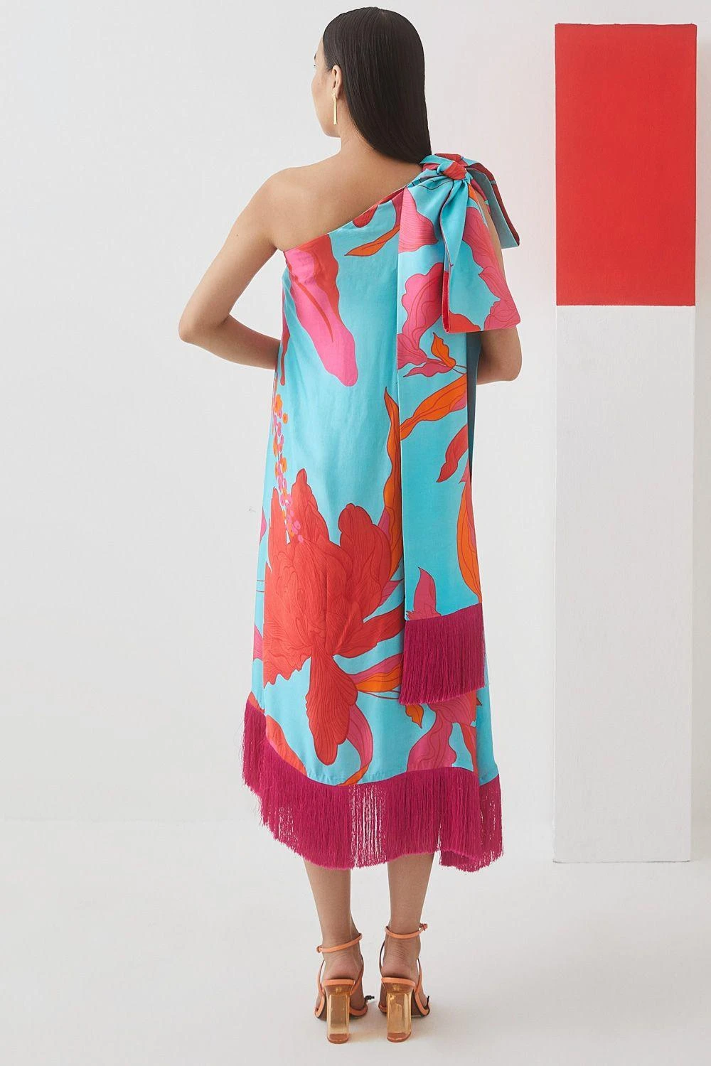 Envisioned for a luxurious getaway, this trans-seasonal dress embodies laid back vacation style. Crafted in vegan silk, this blue rose A-line dress features a one shoulder detail with a hibiscus print & a bow on one side.