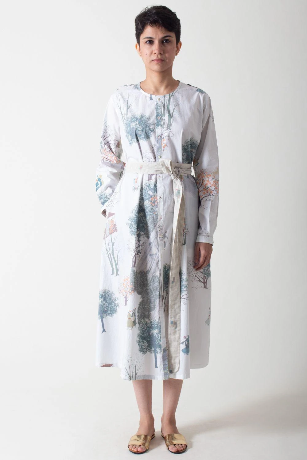The spring season calls for light & airy pieces that are both stylish & comfortable. This white printed sundress is cut in poplin with a button down placket which helps to adjust the length. It is cinched with a matching fabric belt.