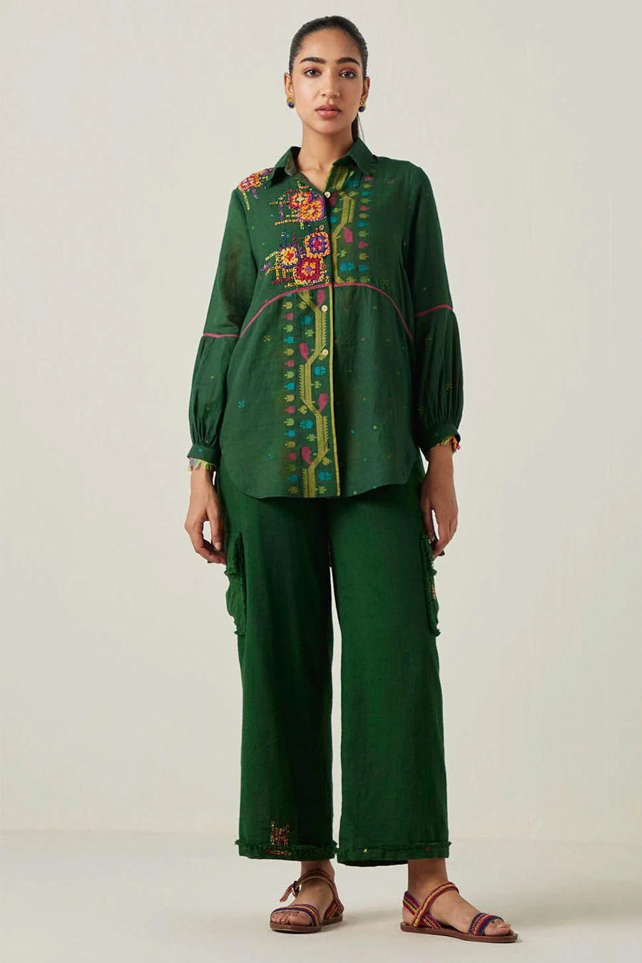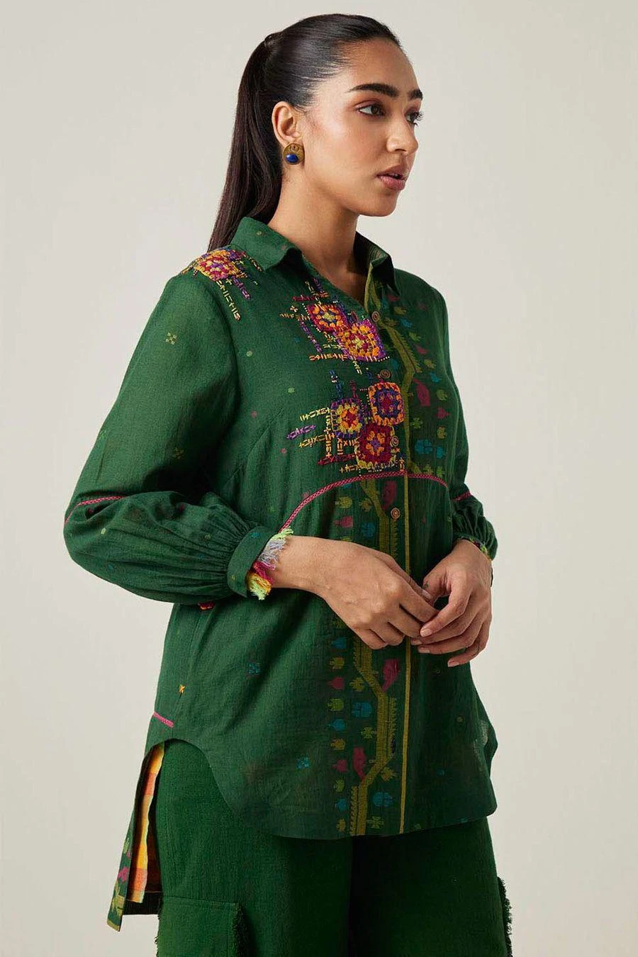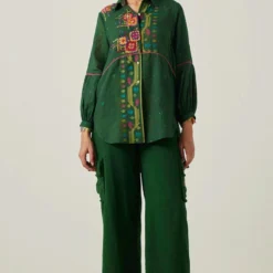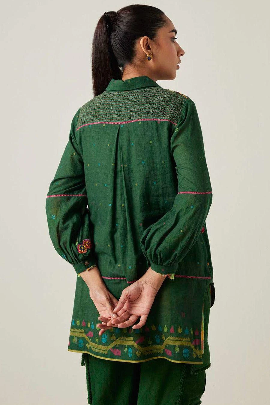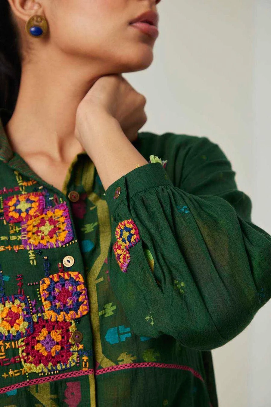 This shirt in jamdani muslin textile features a classic collar with full sleeves with an asymmetrical curved hem. The shirt has a striped smocked back yoke with intricate multicoloured crocheted knitted patches & blocks stitched on a loom.