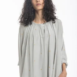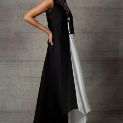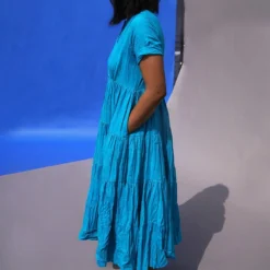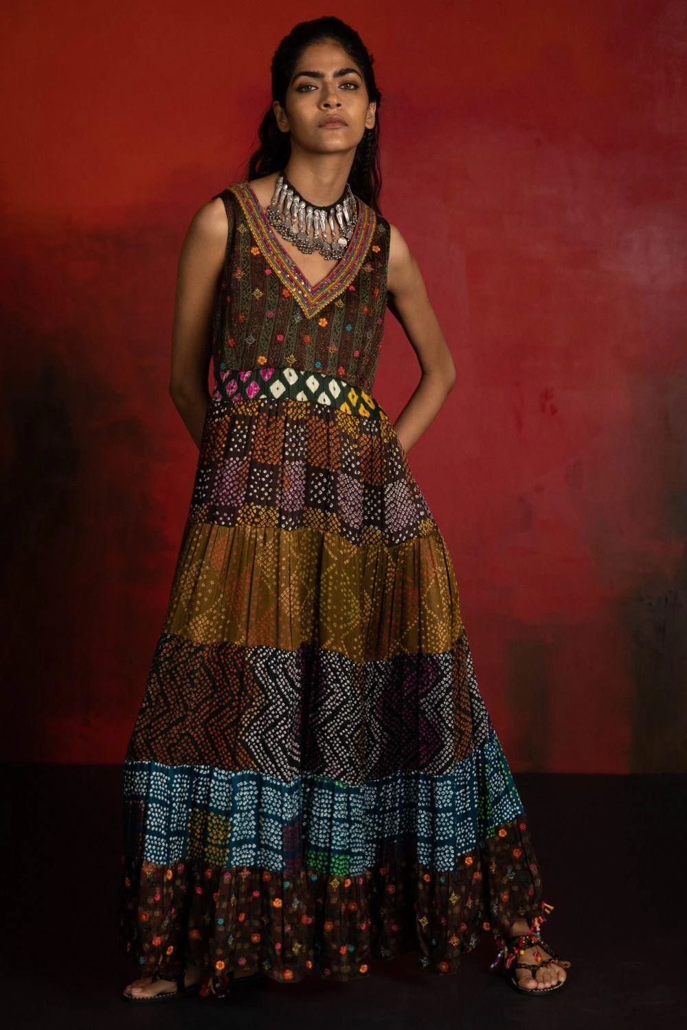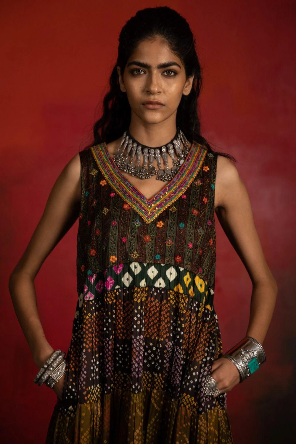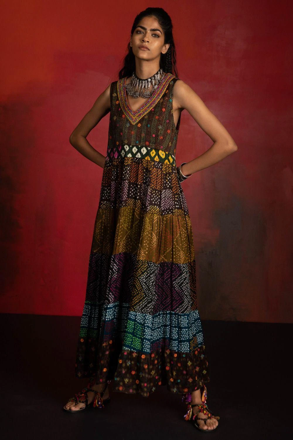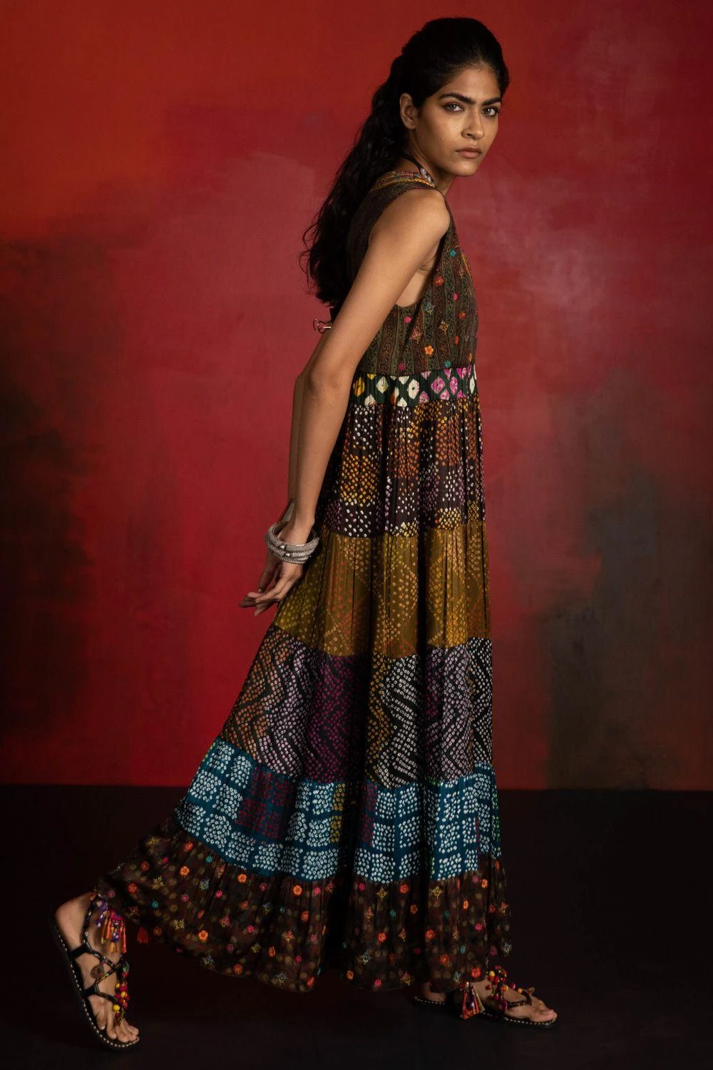 This sleeveless tiered maxi dress is set in modal & gajji silk. It is hand block printed using natural dyes. The surface embellishments are inspired by traditional folk embroidery. Style this piece for dressy daytime events with statement earrings.