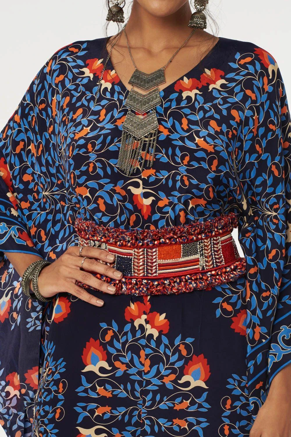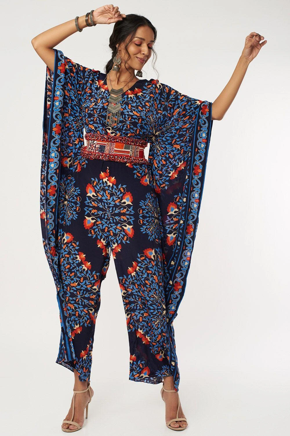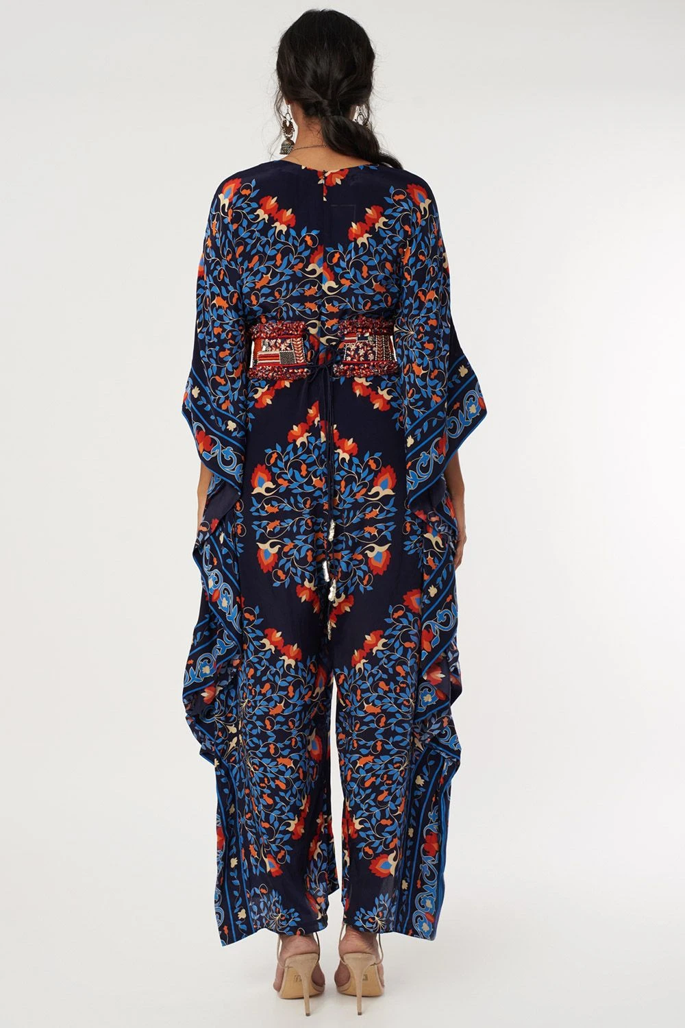 Look effortlessly stylish in this kaftan style jumpsuit. Crafted in crepe silk, this jumpsuit features a butta print paired with a patchwork embellished belt. Style it with a pair of statement earrings & a stack of bracelets to complete the look.