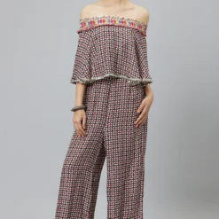 Step into the spotlight with this black geometric print off-shoulder jumpsuit. Its captivating design effortlessly merges fashion and artistry. The attached cape adds a touch of drama, while the off-shoulder style exudes elegance.