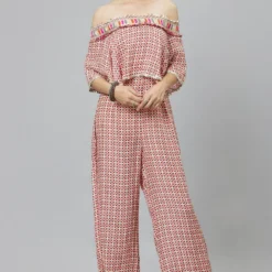 Step into the spotlight with this ivory geometric print off-shoulder jumpsuit. Its captivating design effortlessly merges fashion and artistry. The attached cape adds a touch of drama, while the off-shoulder style exudes elegance.