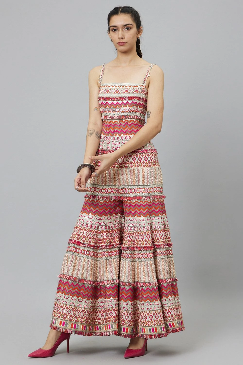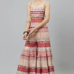 Step into elegance with this Ivory Multi Hued Bell Bottom Jumpsuit. The embodiment of timeless sophistication, its flowing silhouette and vibrant hues create a statement of graceful allure.