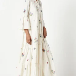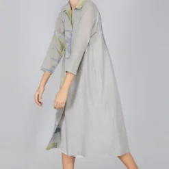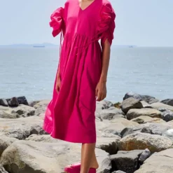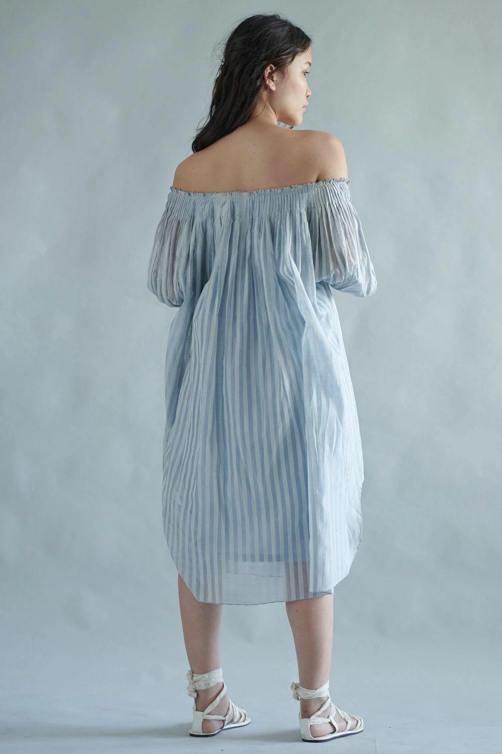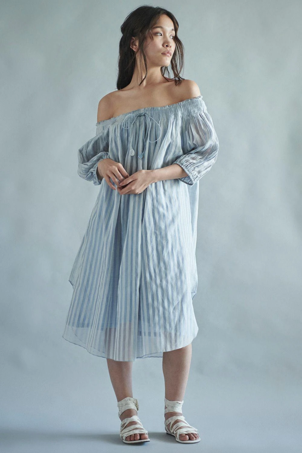 This striped blue easy breezy dress in yarn dyed handwoven silk chanderi features an adjustable neckline, which can be converted into an off-shoulder or a round scoop neckline. Style it with a pair of oversized hoops for an elevated look.