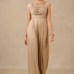 Step into the limelight with this metallic crinkle straight jumpsuit. Its draped bodice and intricate sequin embroidery make it a captivating choice for any occasion.