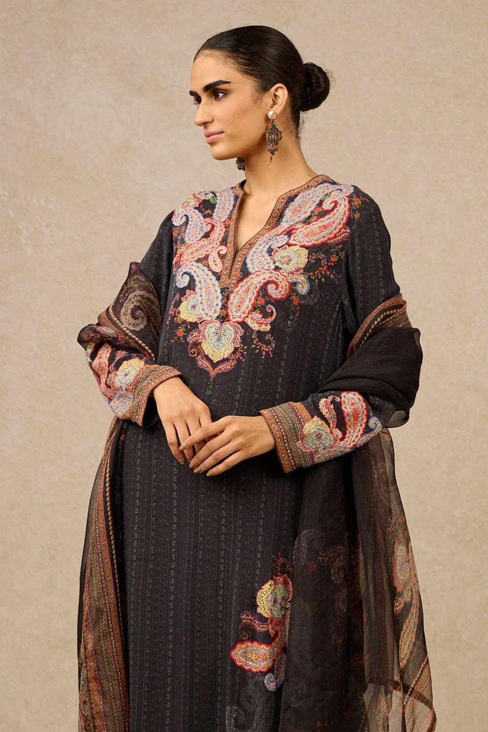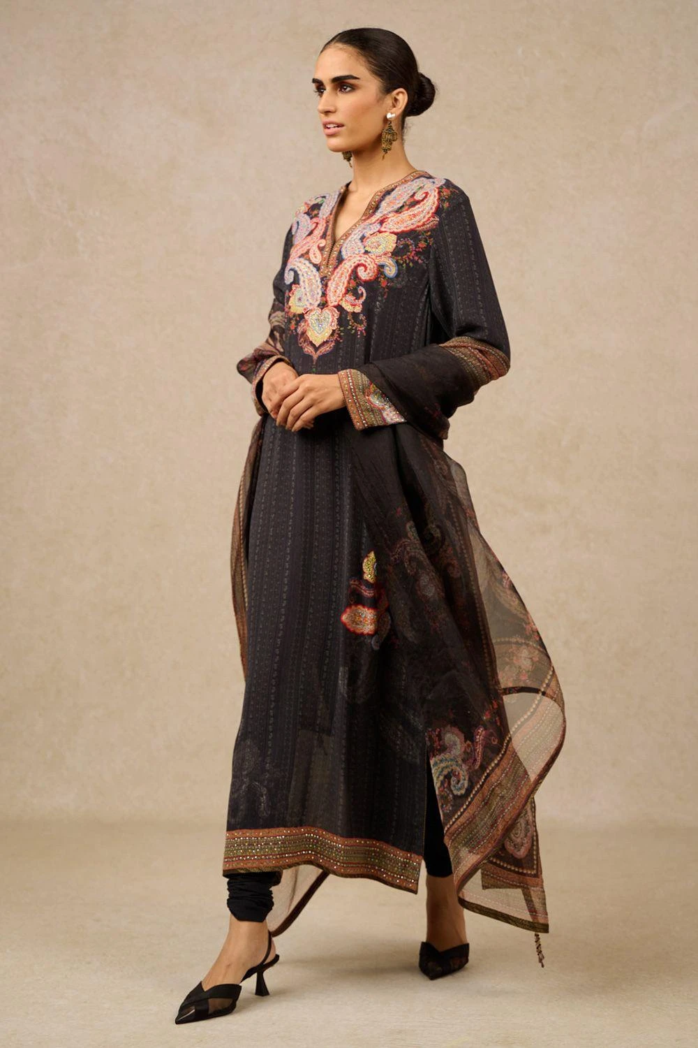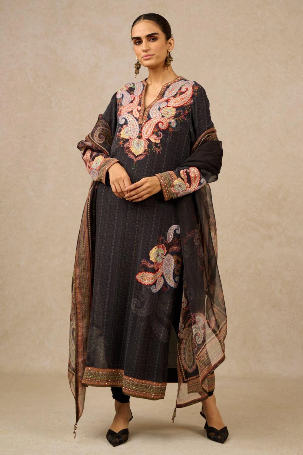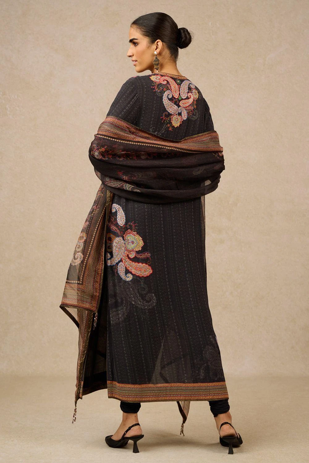 Elevate your style with a black paisley-printed, hand-embroidered georgette long kurta paired with a stretch net churidar and a matching sheer silk dupatta. Perfect for cultural events, where traditional charm meets contemporary flair.