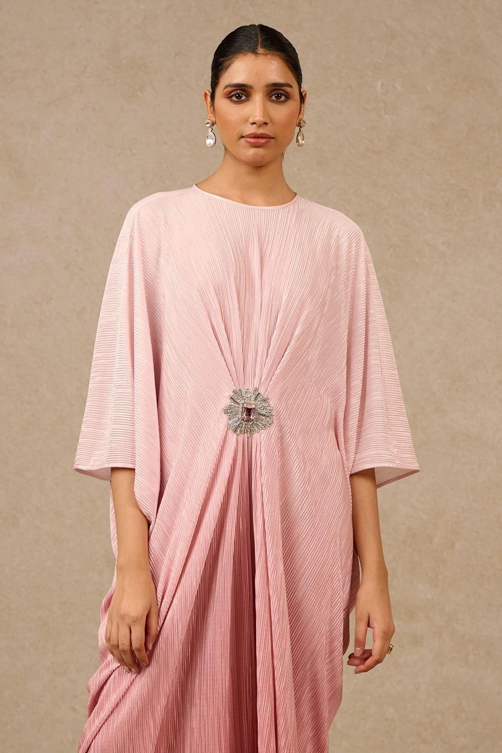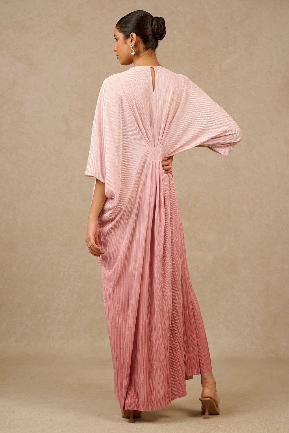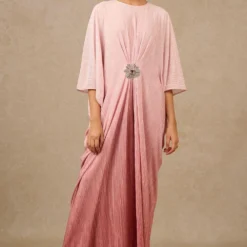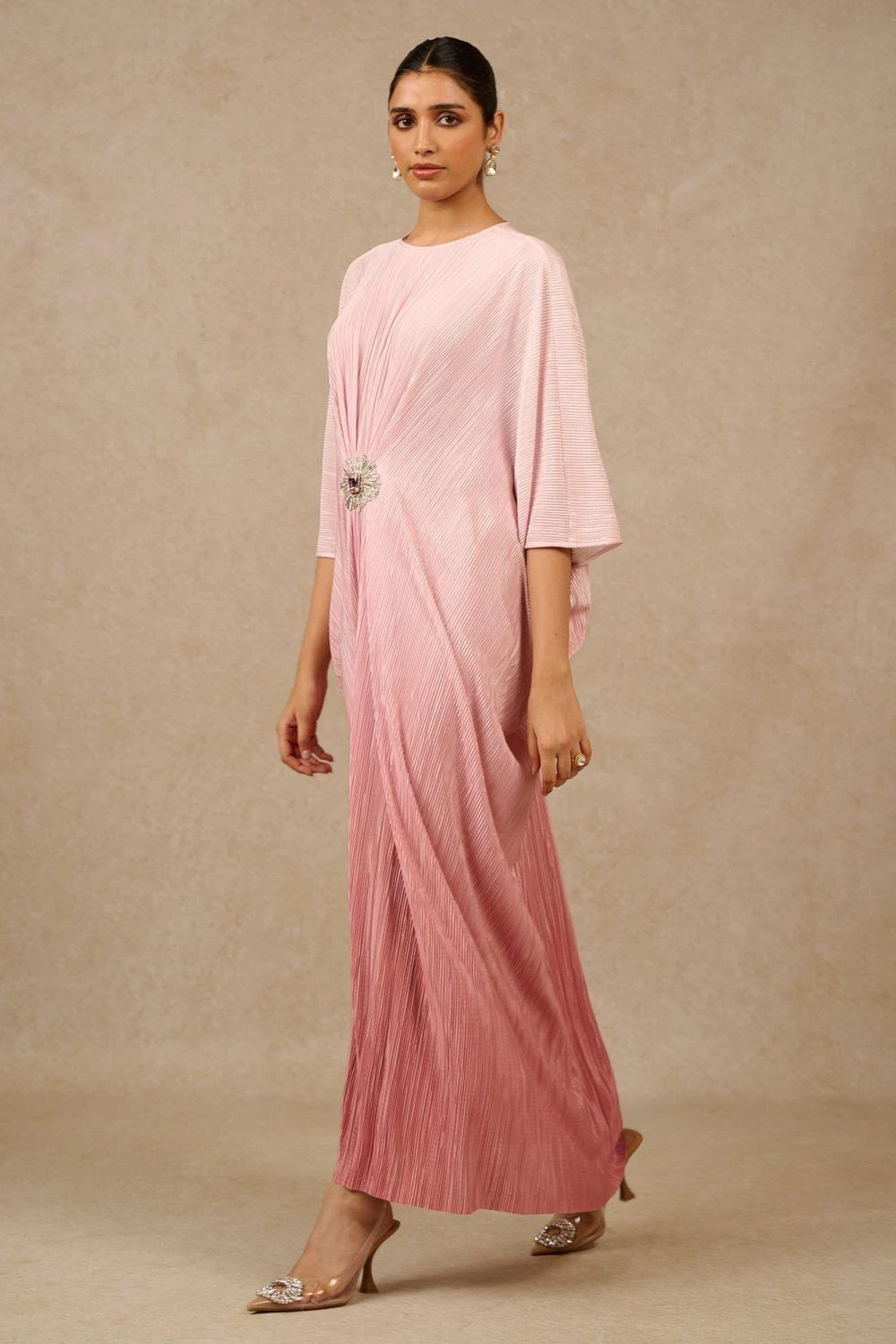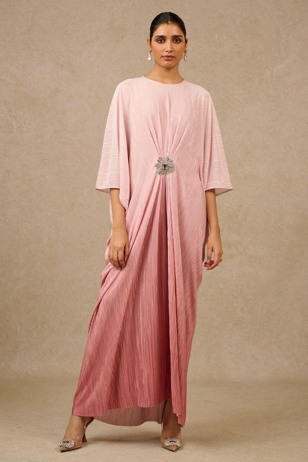 Elevate your look with this kaftan in a pink ombre crinkled fabric. It gracefully combines a flattering fit-to-flair illusion while preserving its loose silhouette, adorned with gathers and a jeweled brooch at the waist for a touch of glamour.