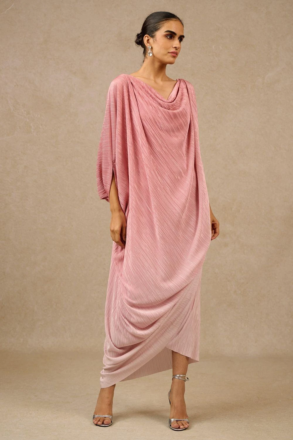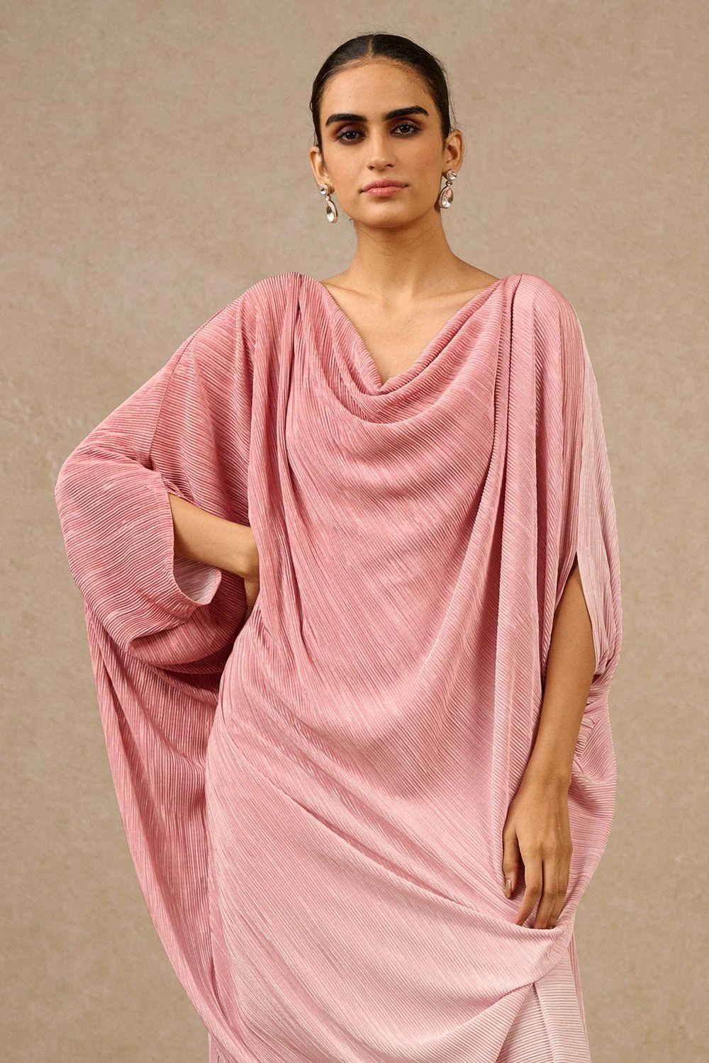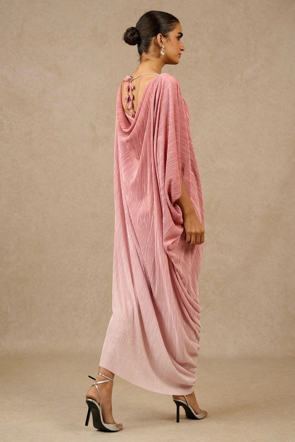 Elevate your style with this asymmetrical off-shoulder kaftan. Crafted in exquisite ombre crinkled fabric, it features subtle gathered details on the shoulders and charming tassels on both sides for a touch of chic sophistication.