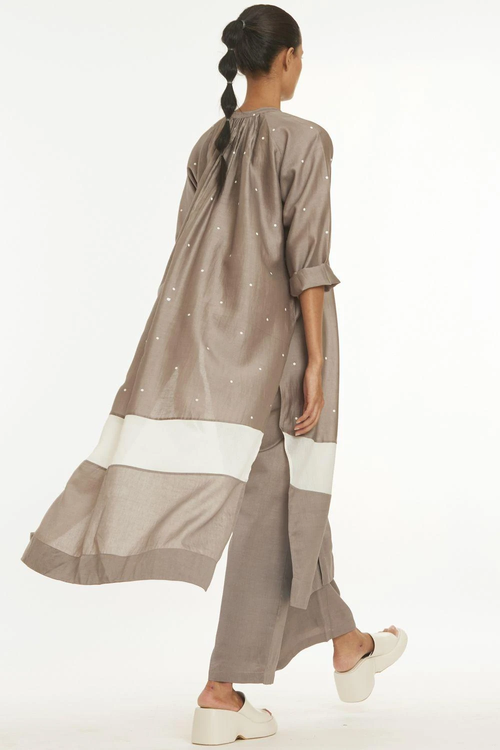 The perfect amalgamation of style & comfort, this kurta set is perfect for a day out. Crafted in chanderi, this set features a gathered neck kurta with polka dots paired with a pair of broad bottoms & a chanderi dupatta.