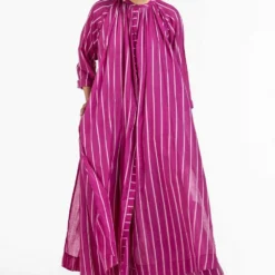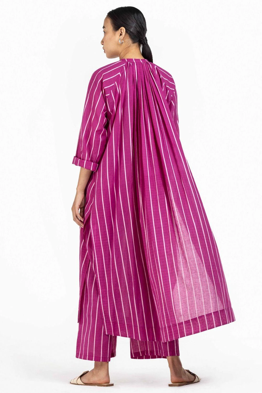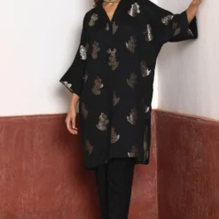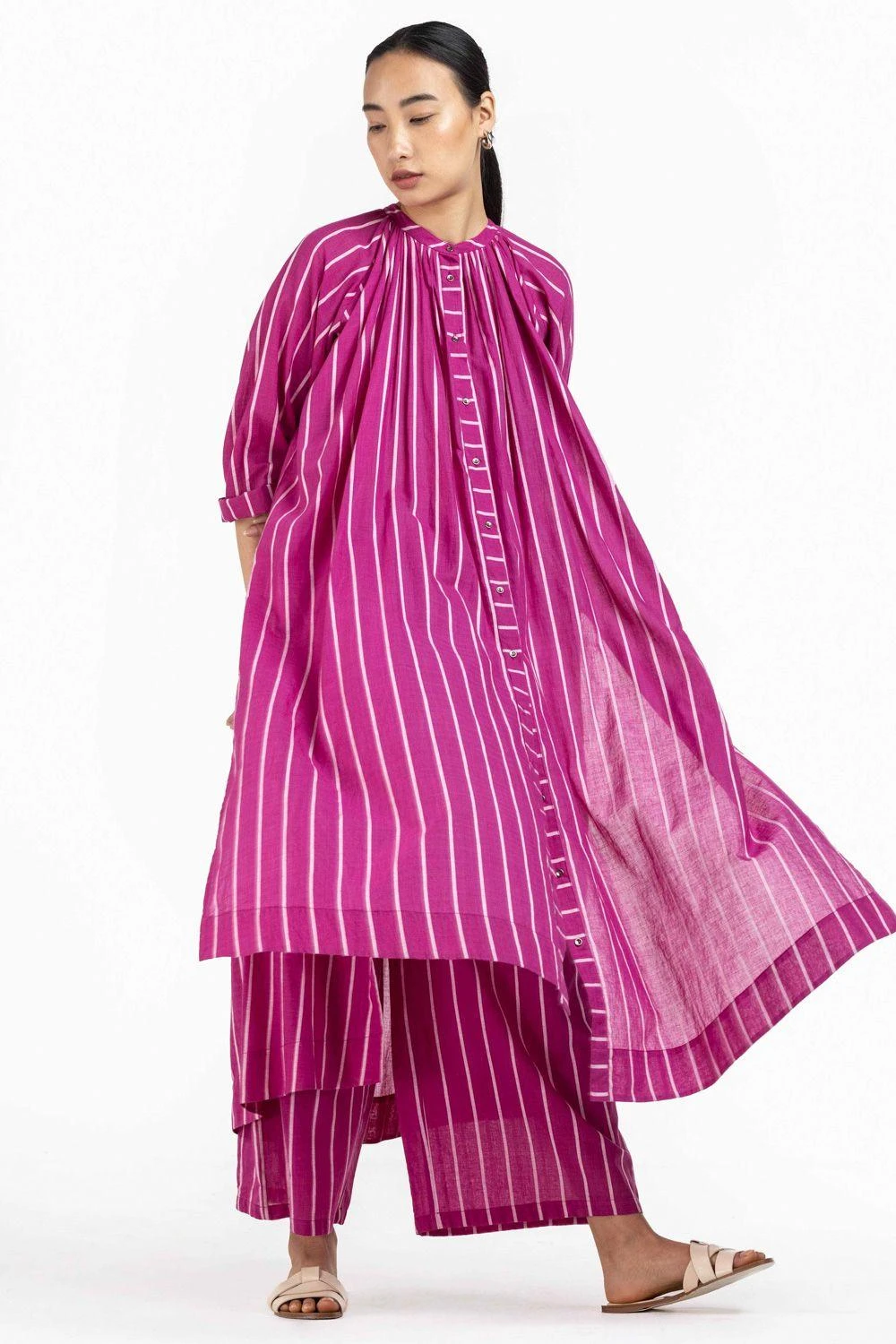 This hot pink tunic set is woven in 100% cotton, in a breezy silhouette. It features a button down tunic with high slits, paired with wide leg pants. Style this look with a pair of statement studs and a crossbody box bag for a chic look.