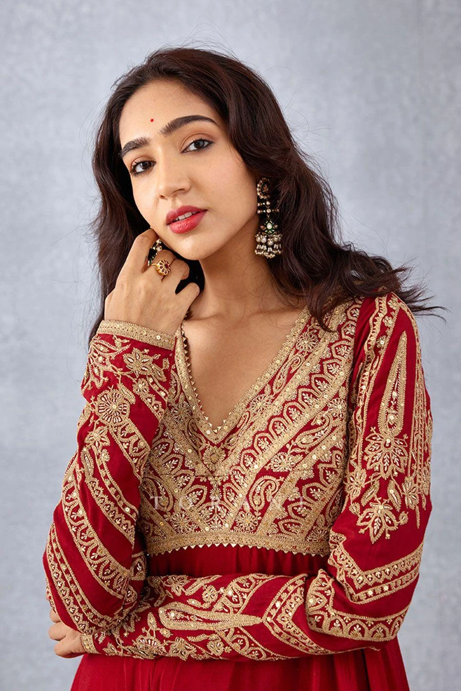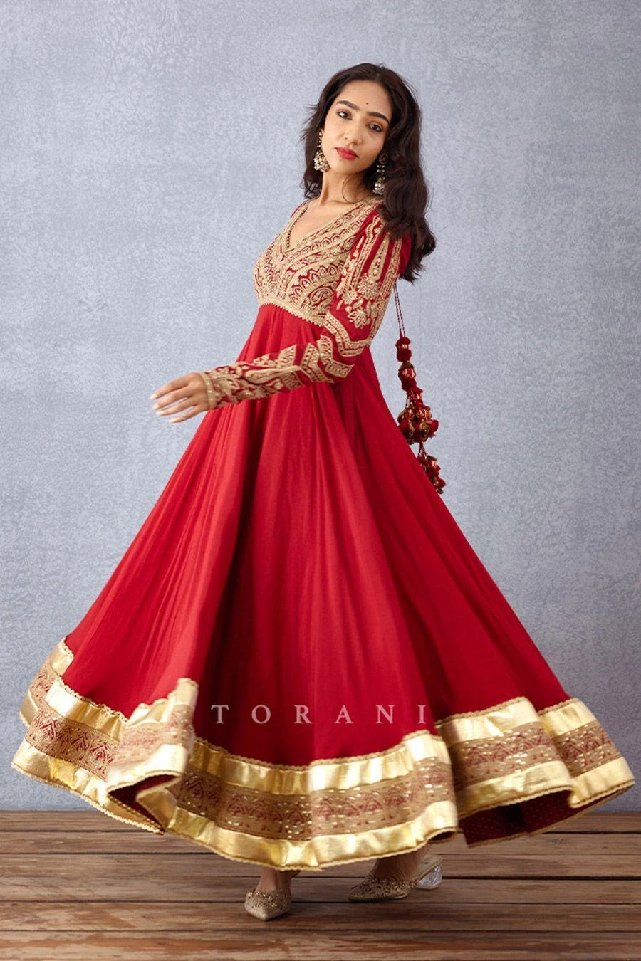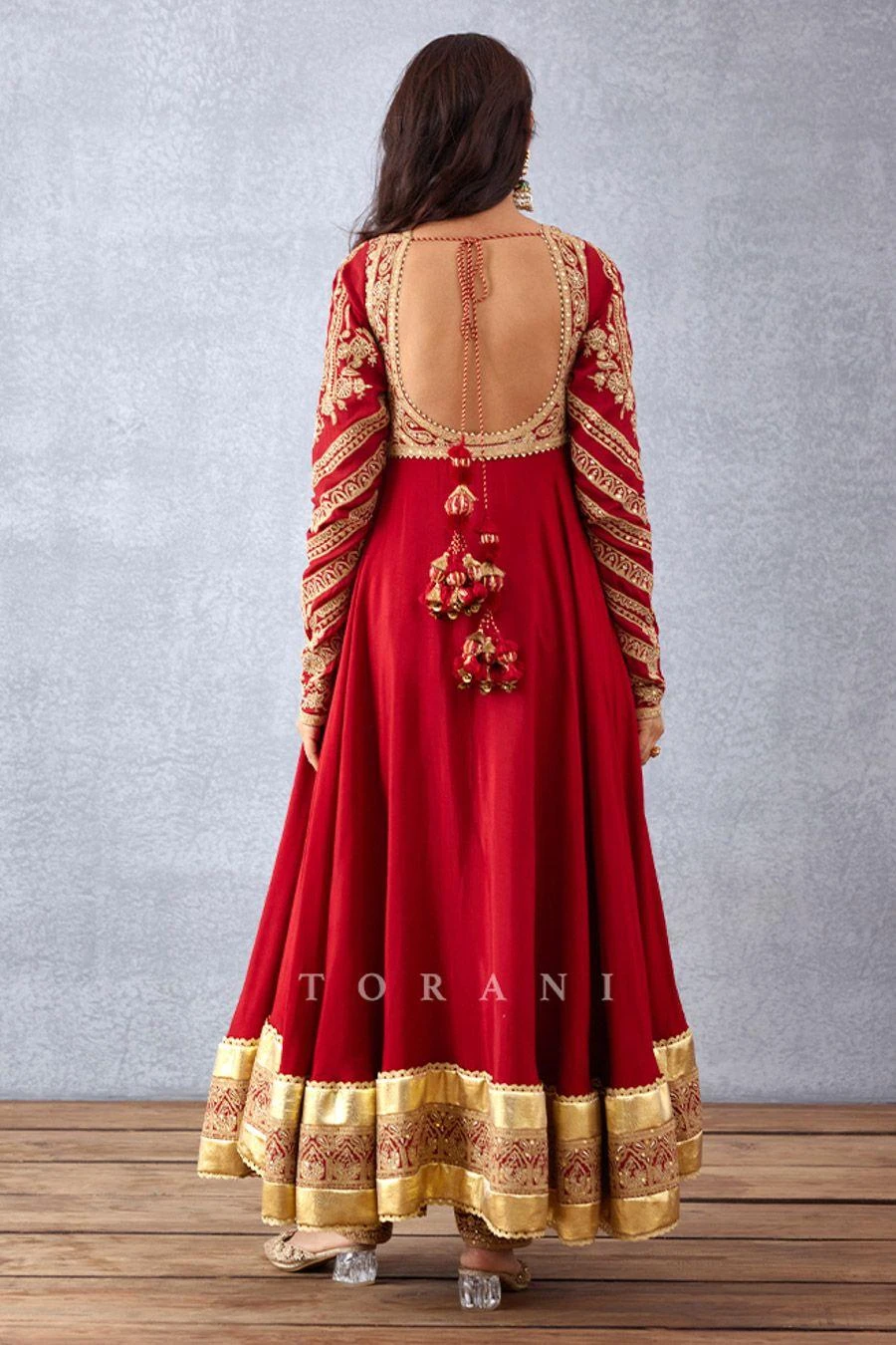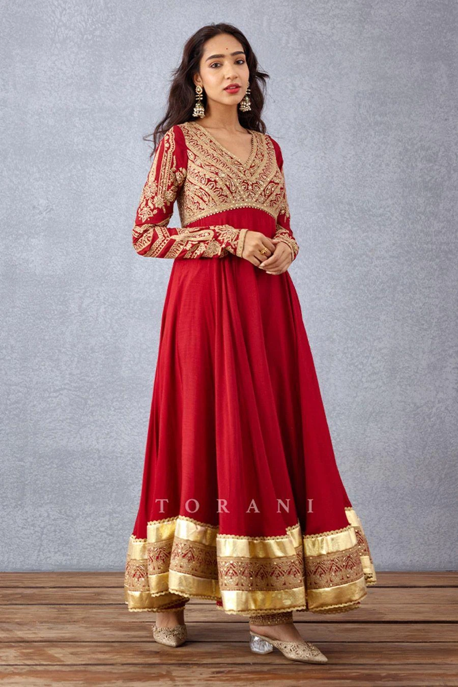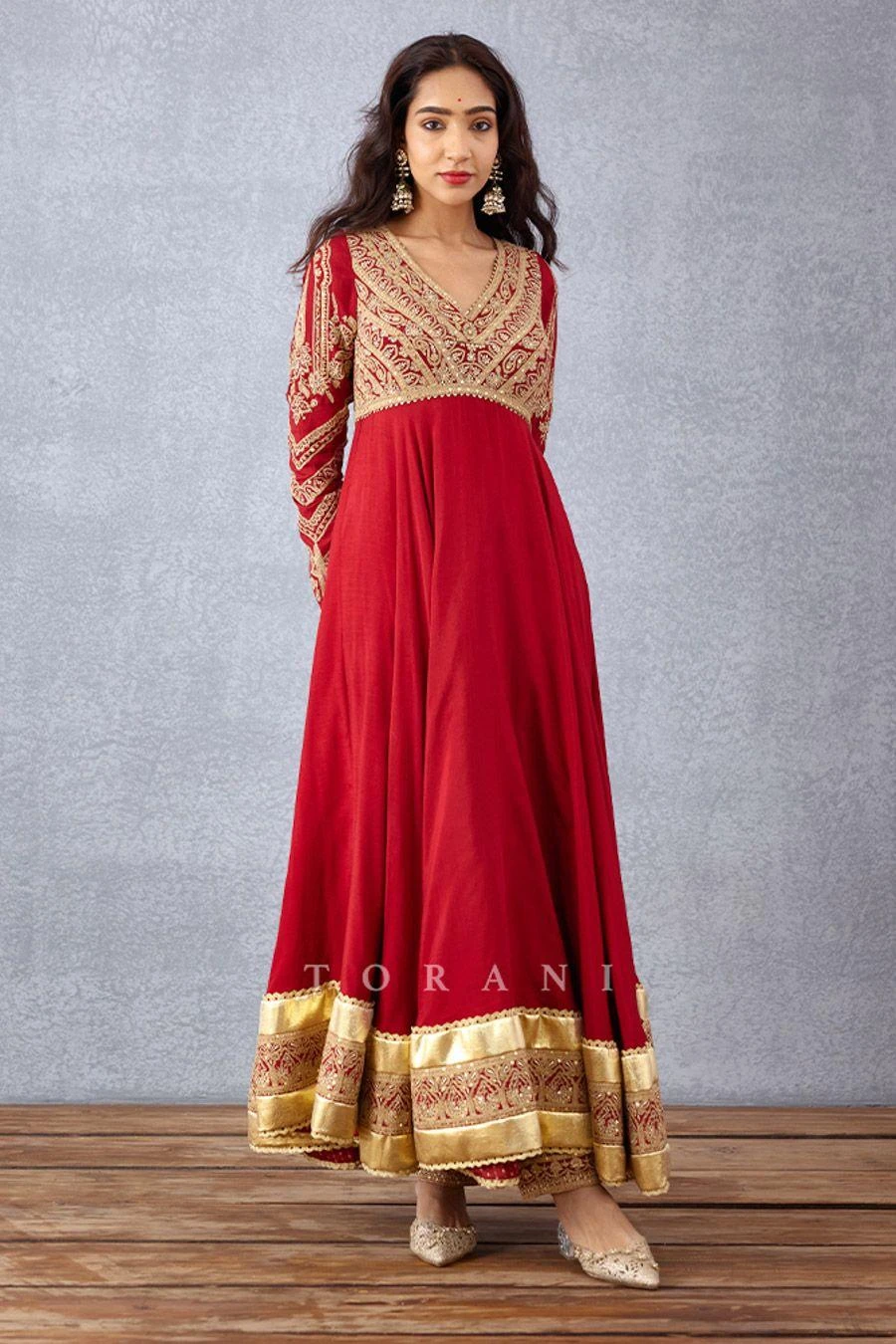 Add this ethereal ensemble to your wedding trousseau for an elegant engagement look. This set features a bright red anarkali with an embroidered yoke paired with wide legged pants and a dupatta.