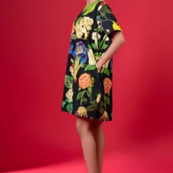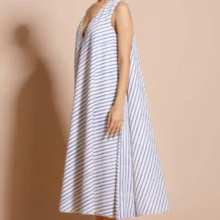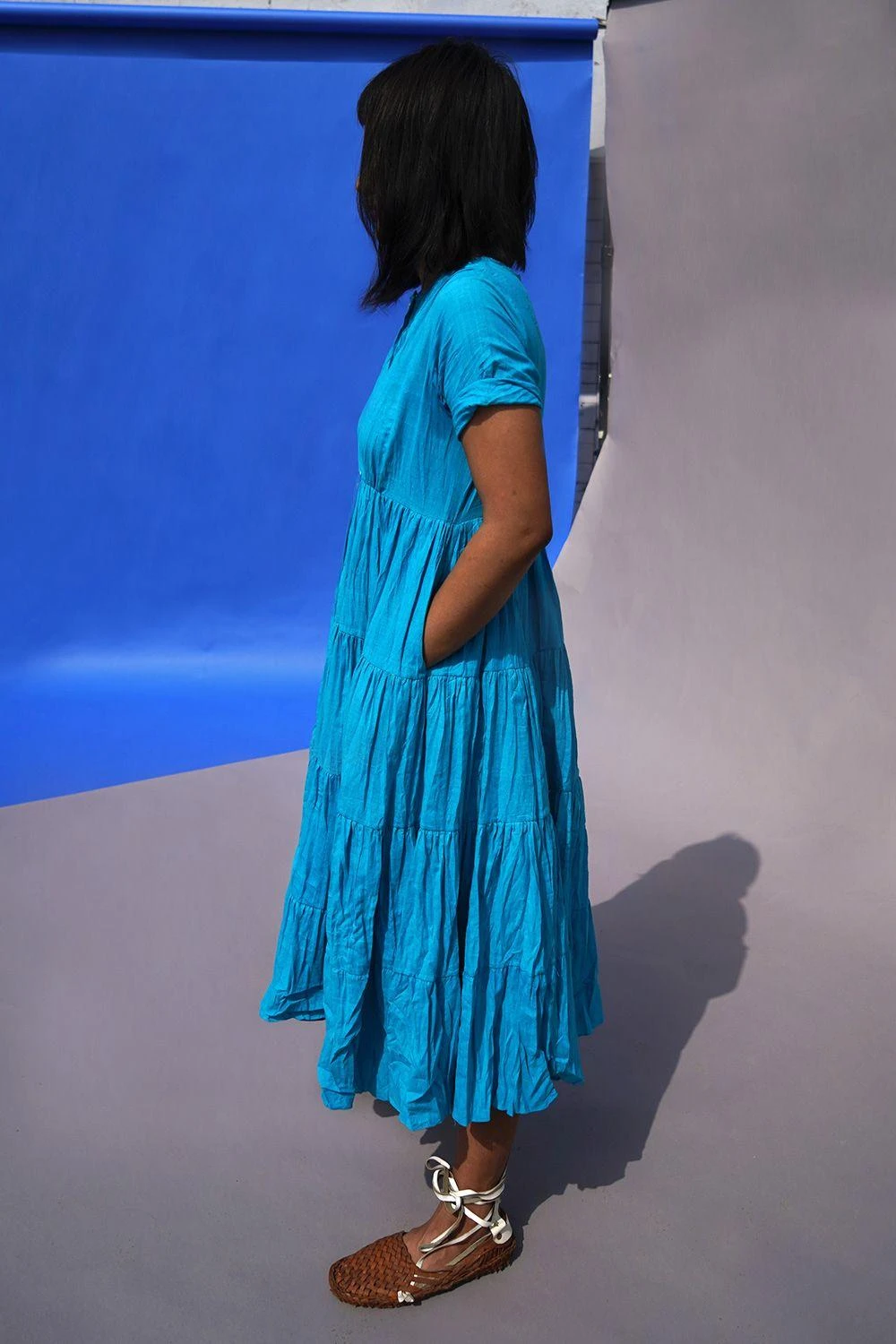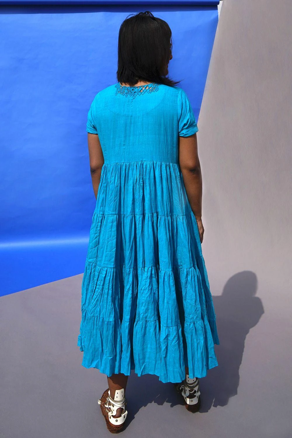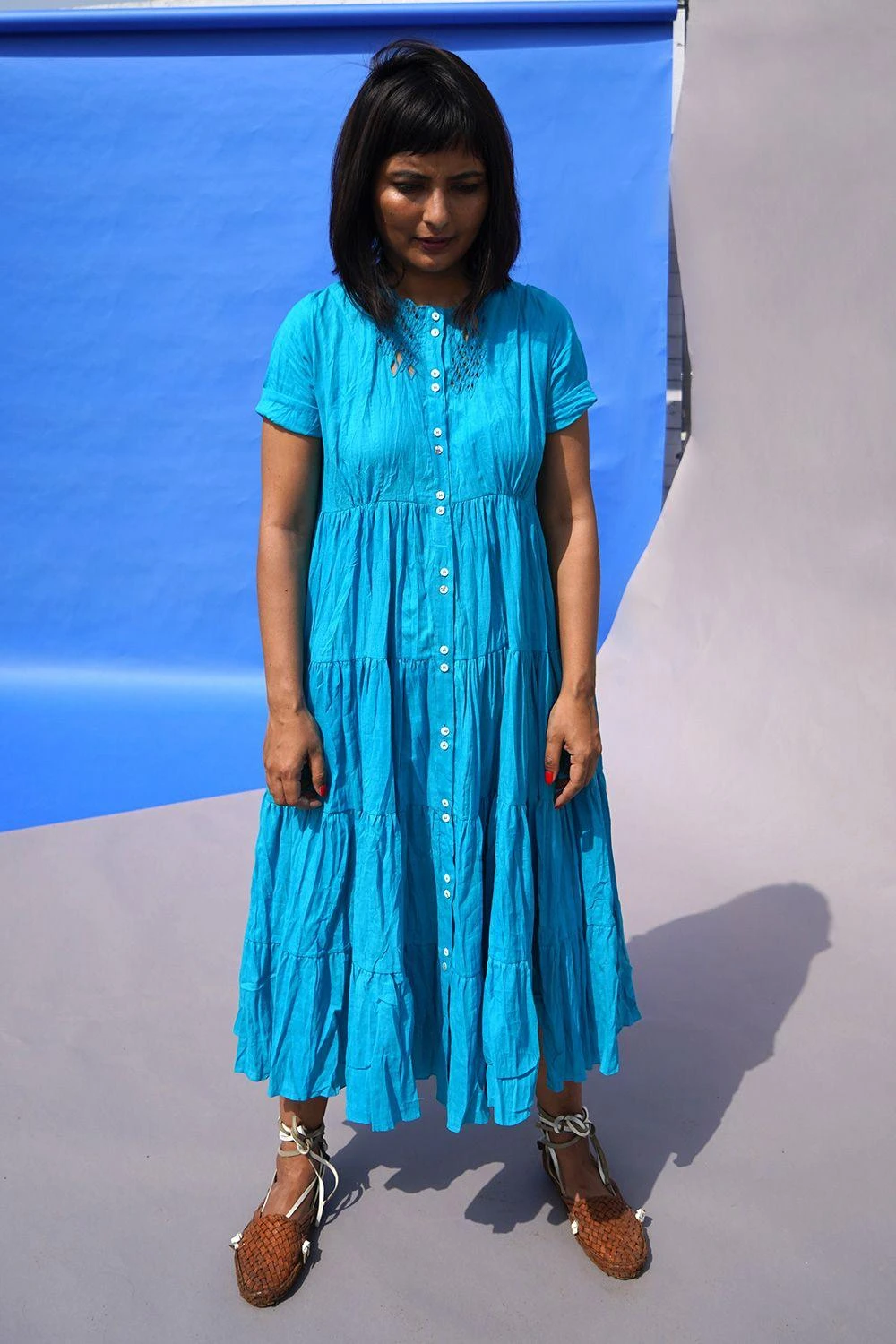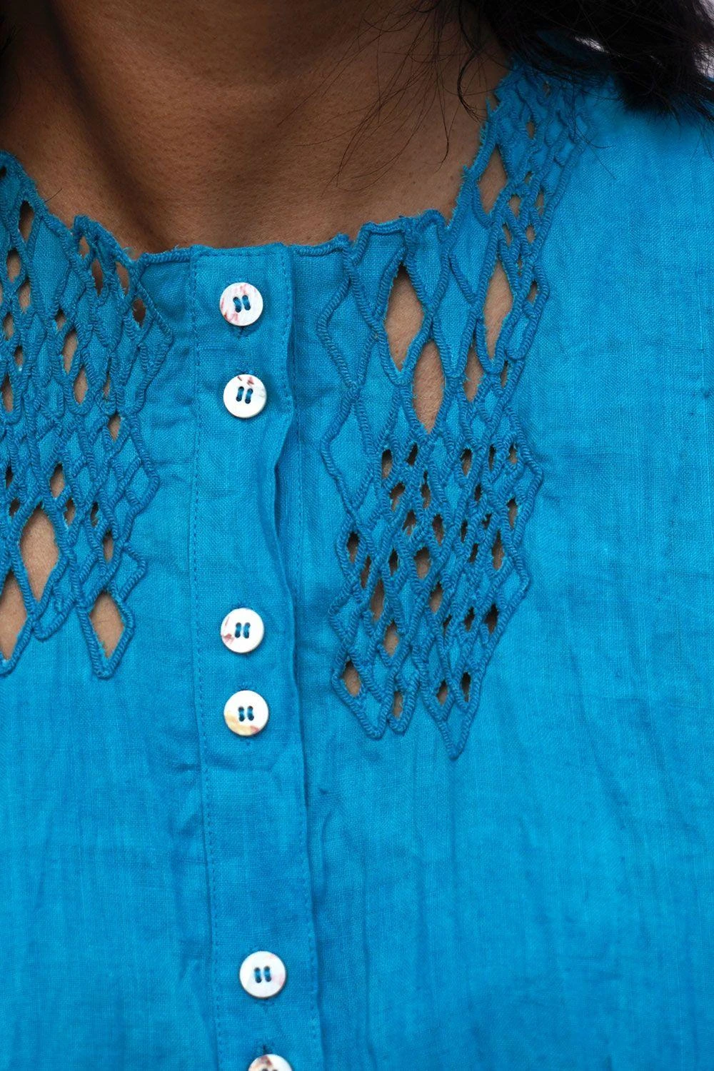 This turquoise blue front open dress is made in handspun, hand woven & hand dyed cotton. It is crafted with hand embroidery & hand cut jaali work. This summery piece is enhanced with delicate mother of pearl button.