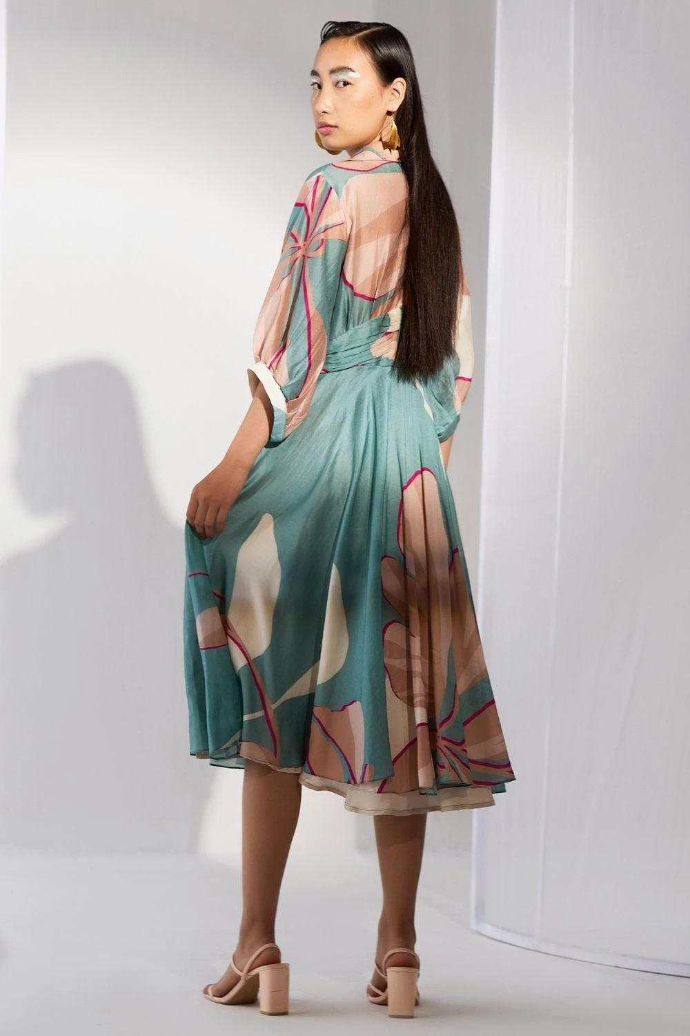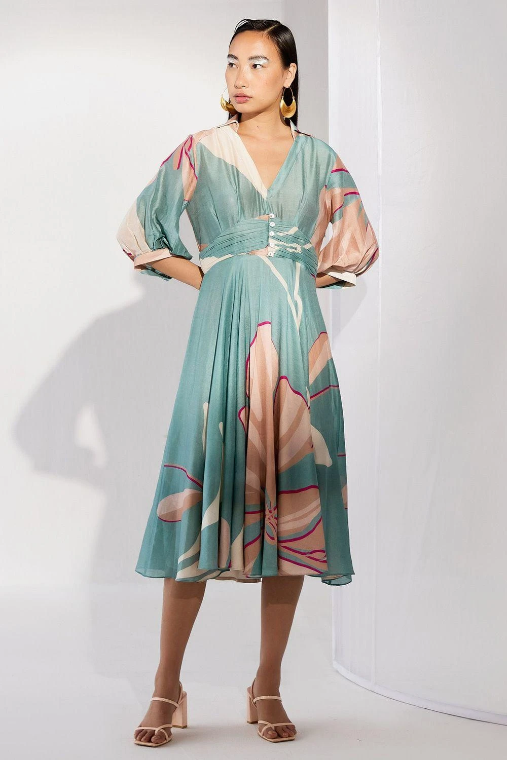 This sea green midi dress epitomizes modern elegance that suits your everyday life. It is cut in handloom chanderi and features cut-out detail on the waist. You can don this look for your daytime soirees.