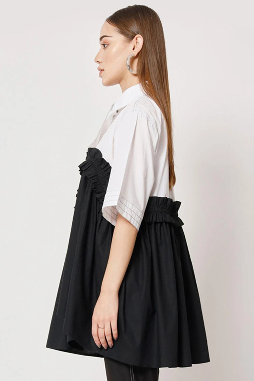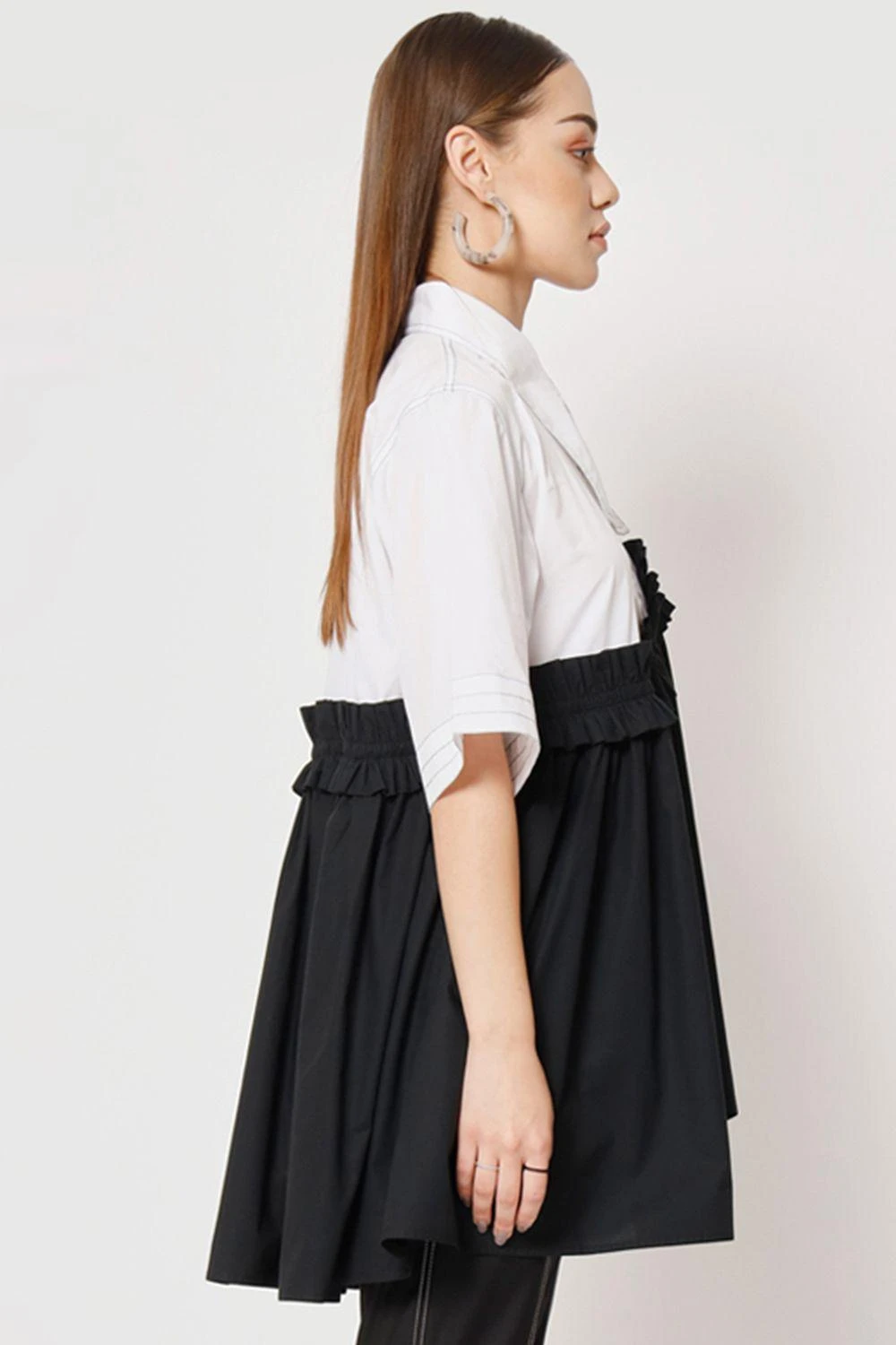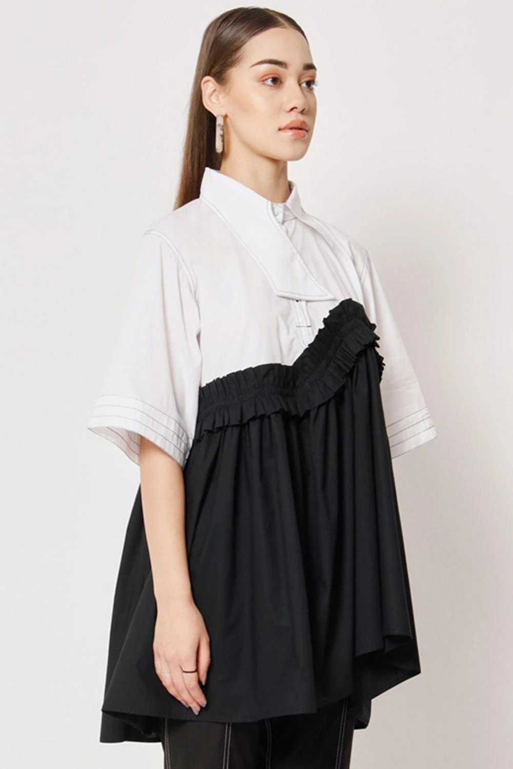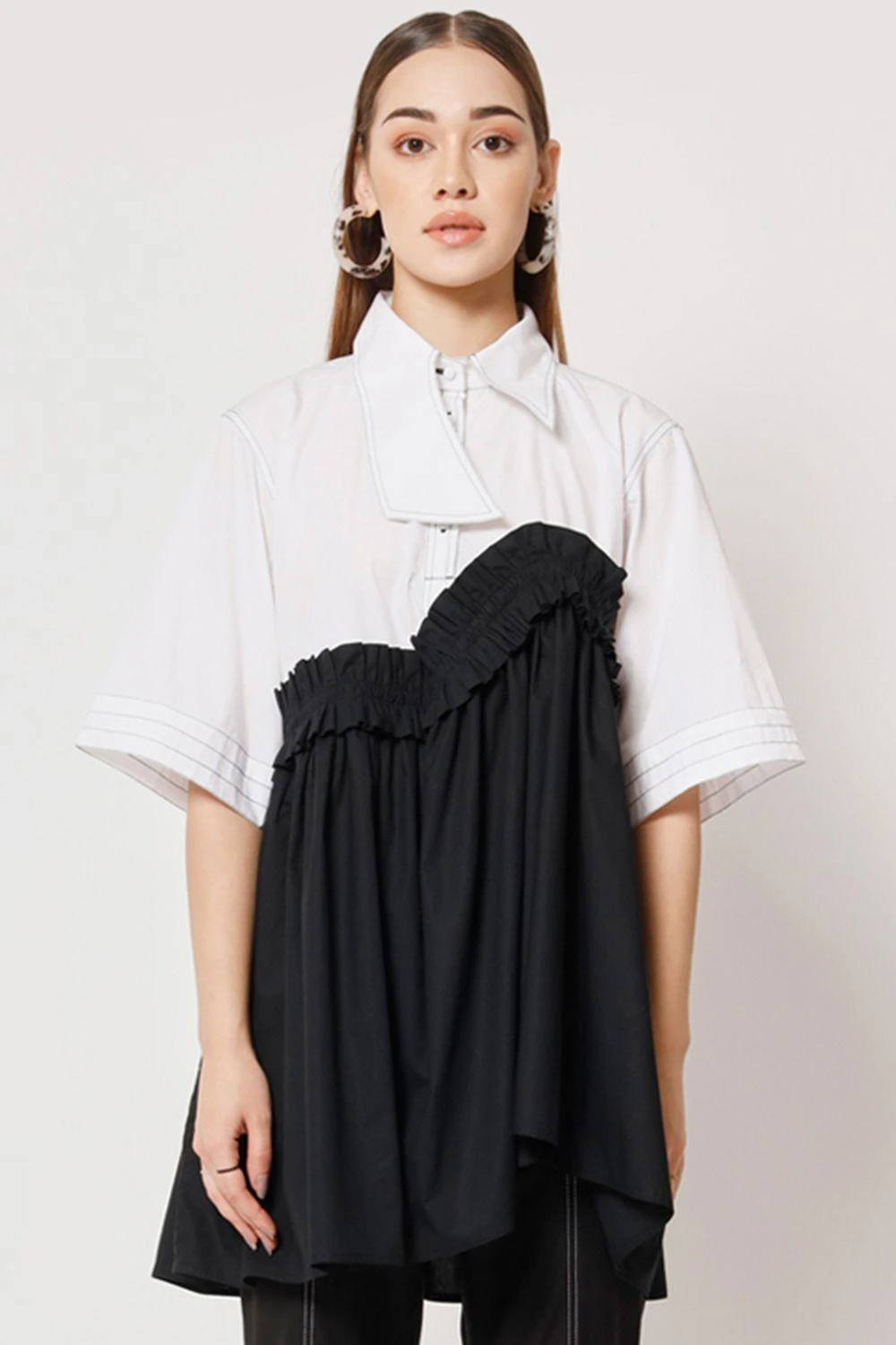Indulge in the effortless charm of this relaxed easy fit blocked top. The asymmetrical ruffle details on the waist create a captivating silhouette.