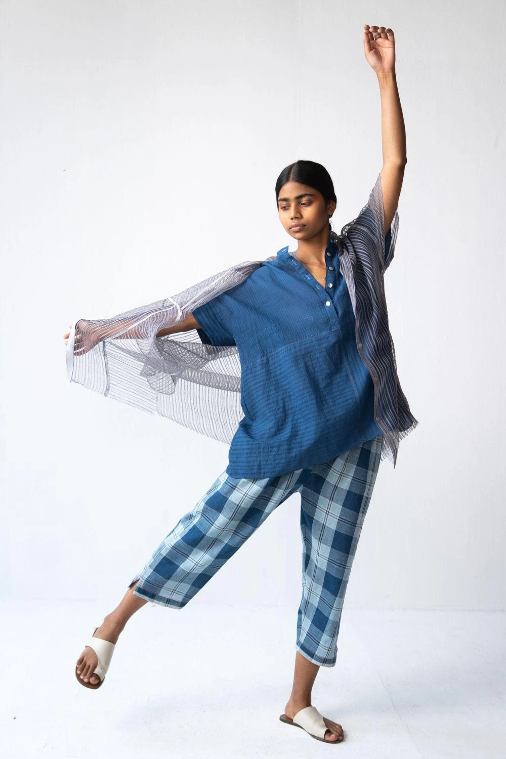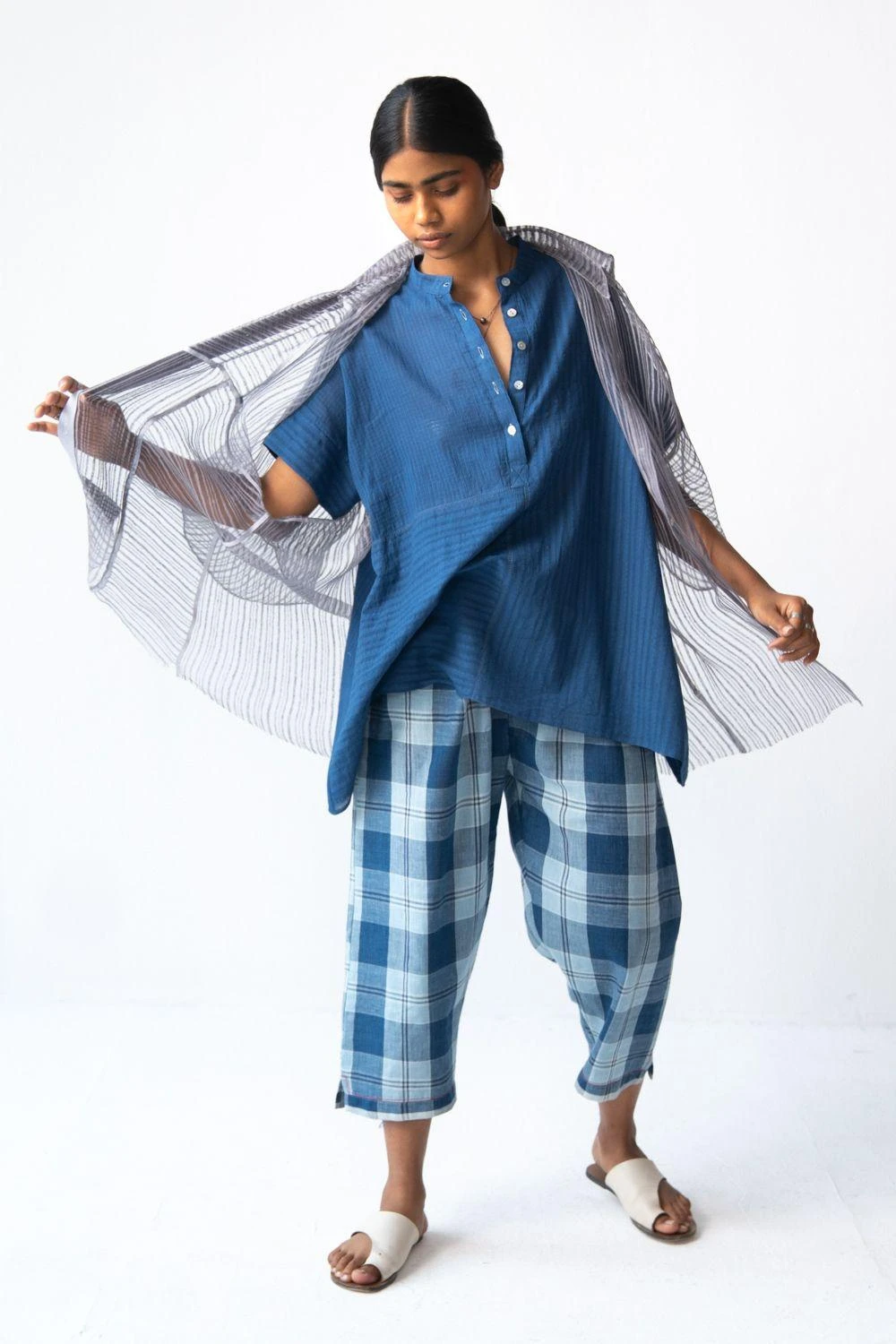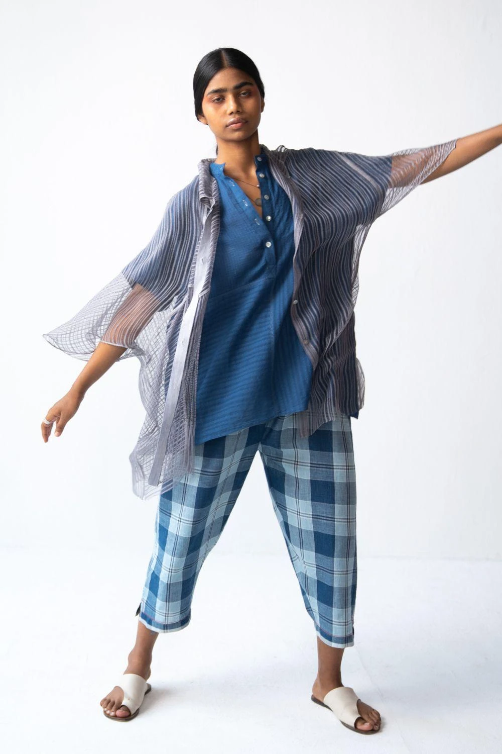 Amplify your look with understated elegance in this printed oversized sheer shirt. This hand block printed shirt is woven in linen noil. Style it with a flowy dress or kurta to add a delicate layer to your looks.