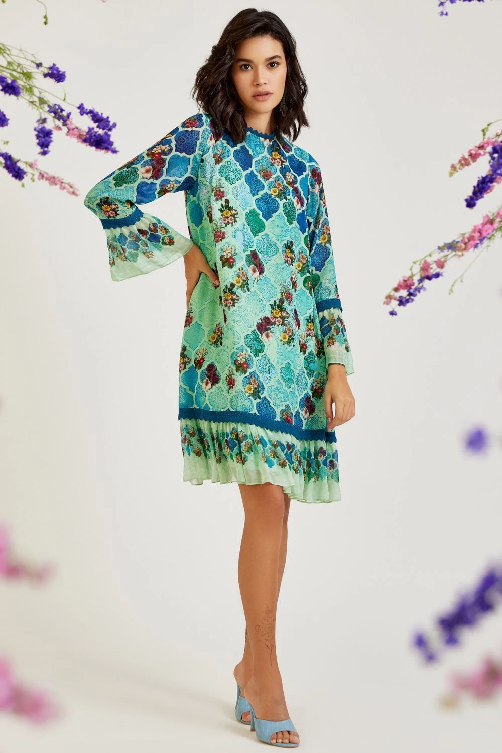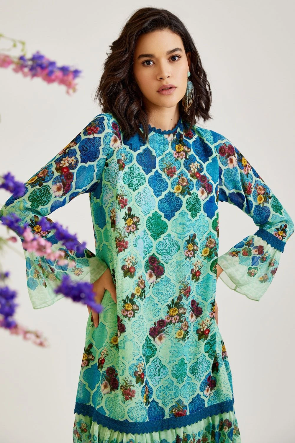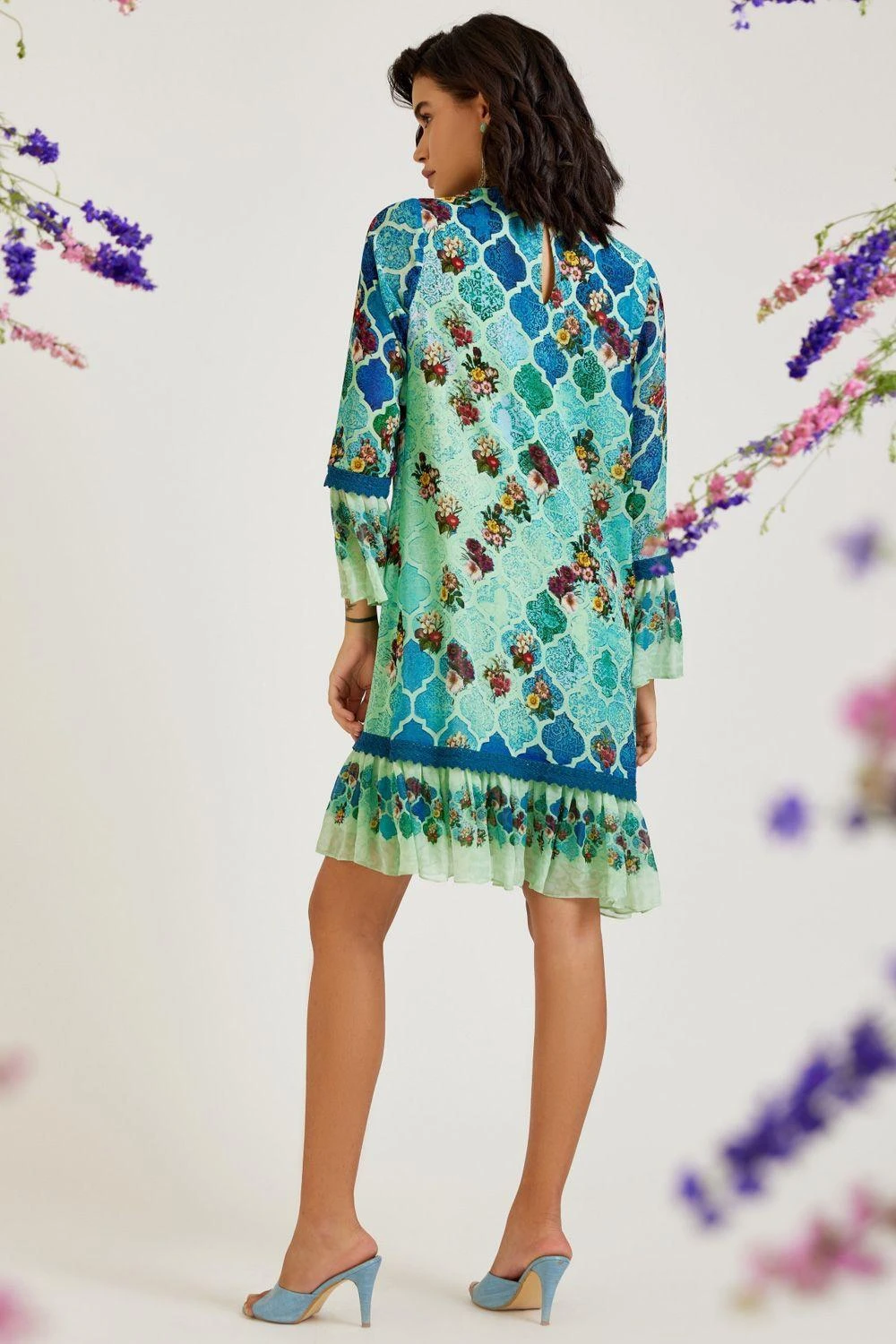 Crafted from luxurious georgette fabric, this A-line dress features a close neck and loose-fit design that provides a unique blend of style and comfort. The dress features ruffles at the hem and sleeves hem, and accentuated with blue lace detailing.