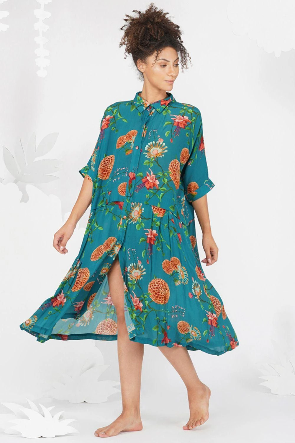 The surreal beauty of florals, accentuated with hand painted strokes in oil paint, is offered in this versatile cora dress. It is cut in crepe viscose in a button down silhouette, allowing you to wear it as a layer as well.