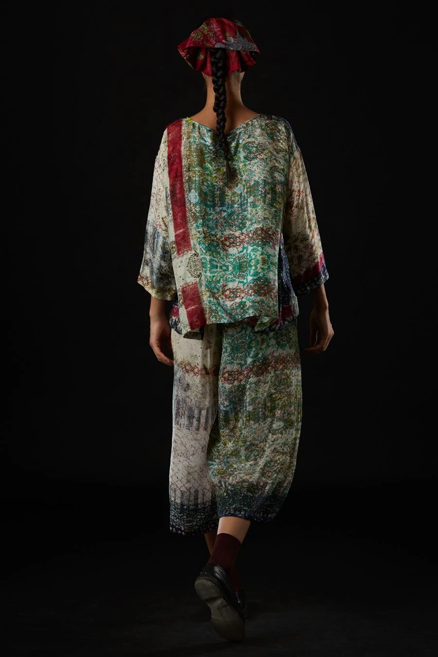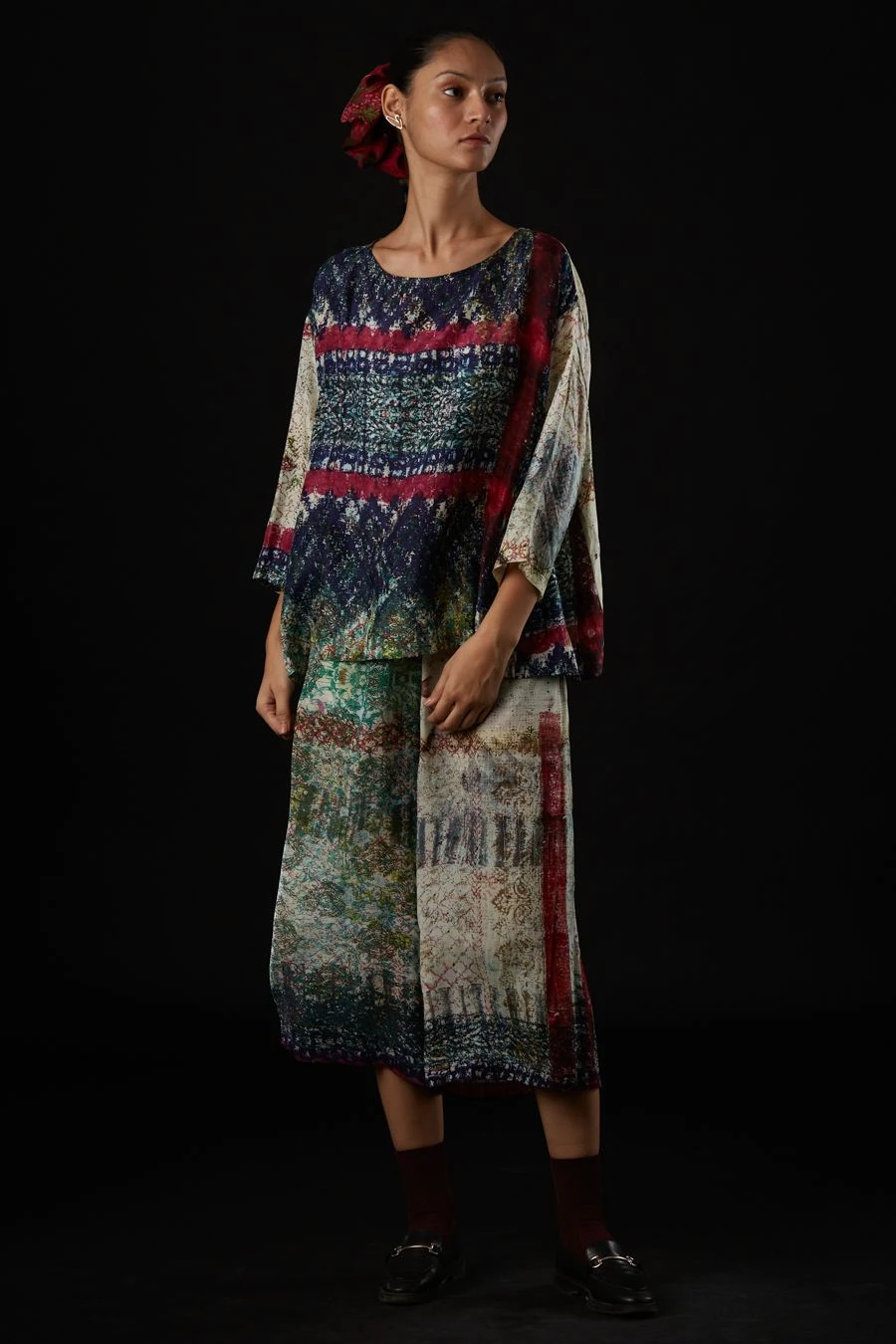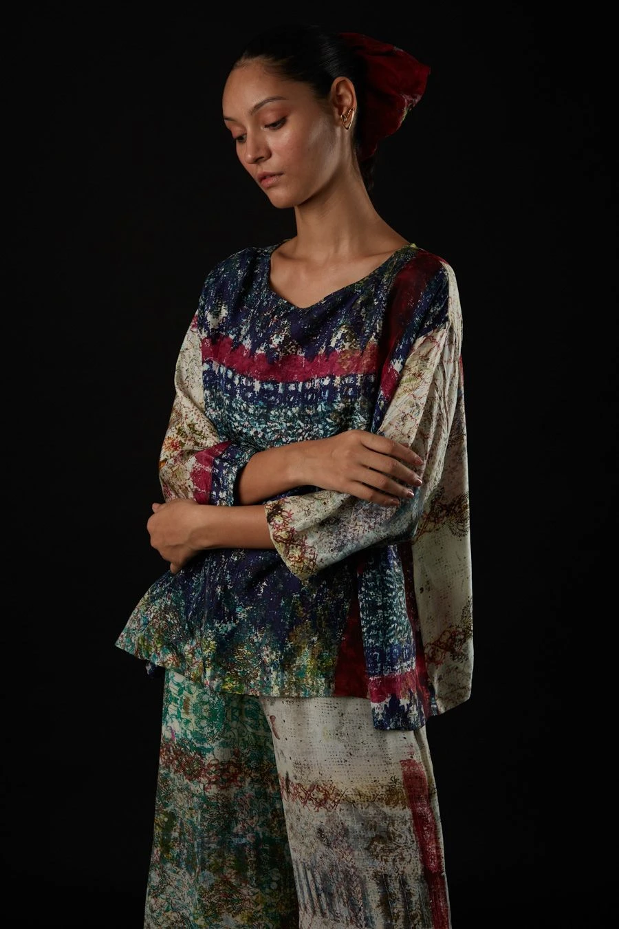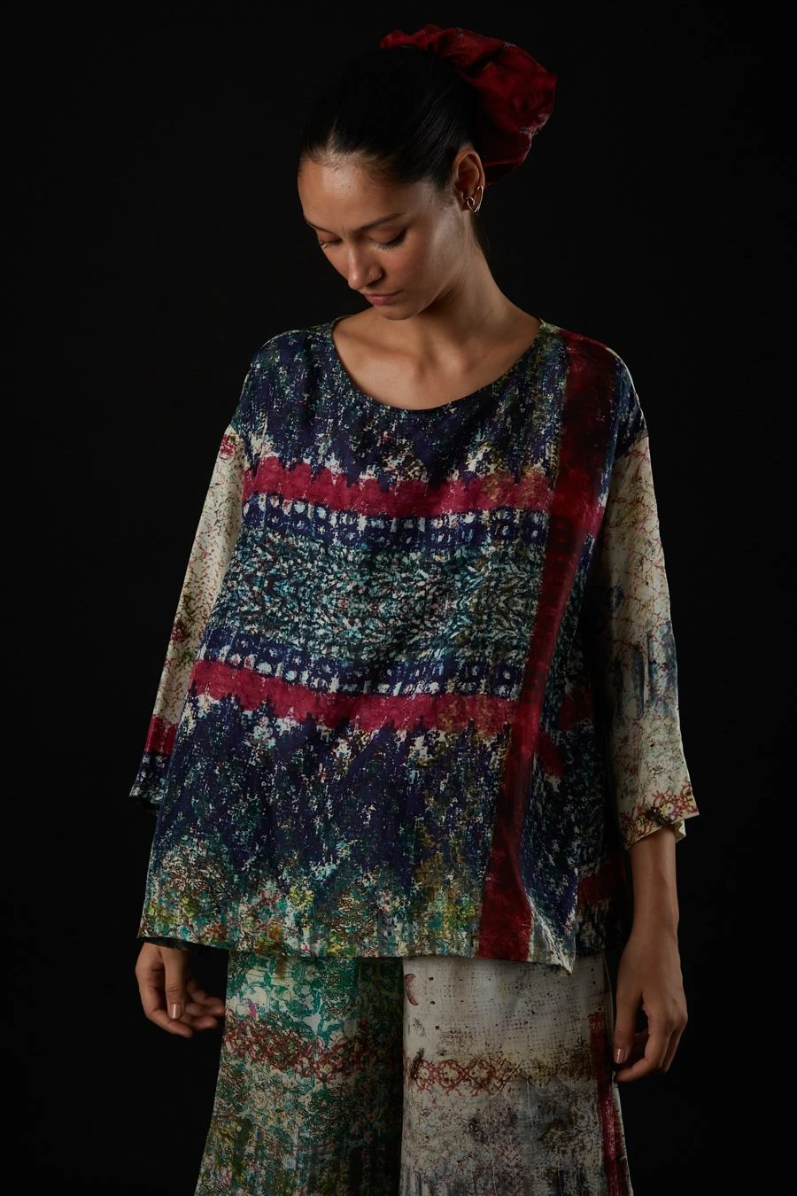 This multicoloured top falls in the realm of luxe minimalism. Yavis signature impressionist print engulfs accents of bold crimson streaks in hues of cerulean and brown on the classic Anaconda Top.